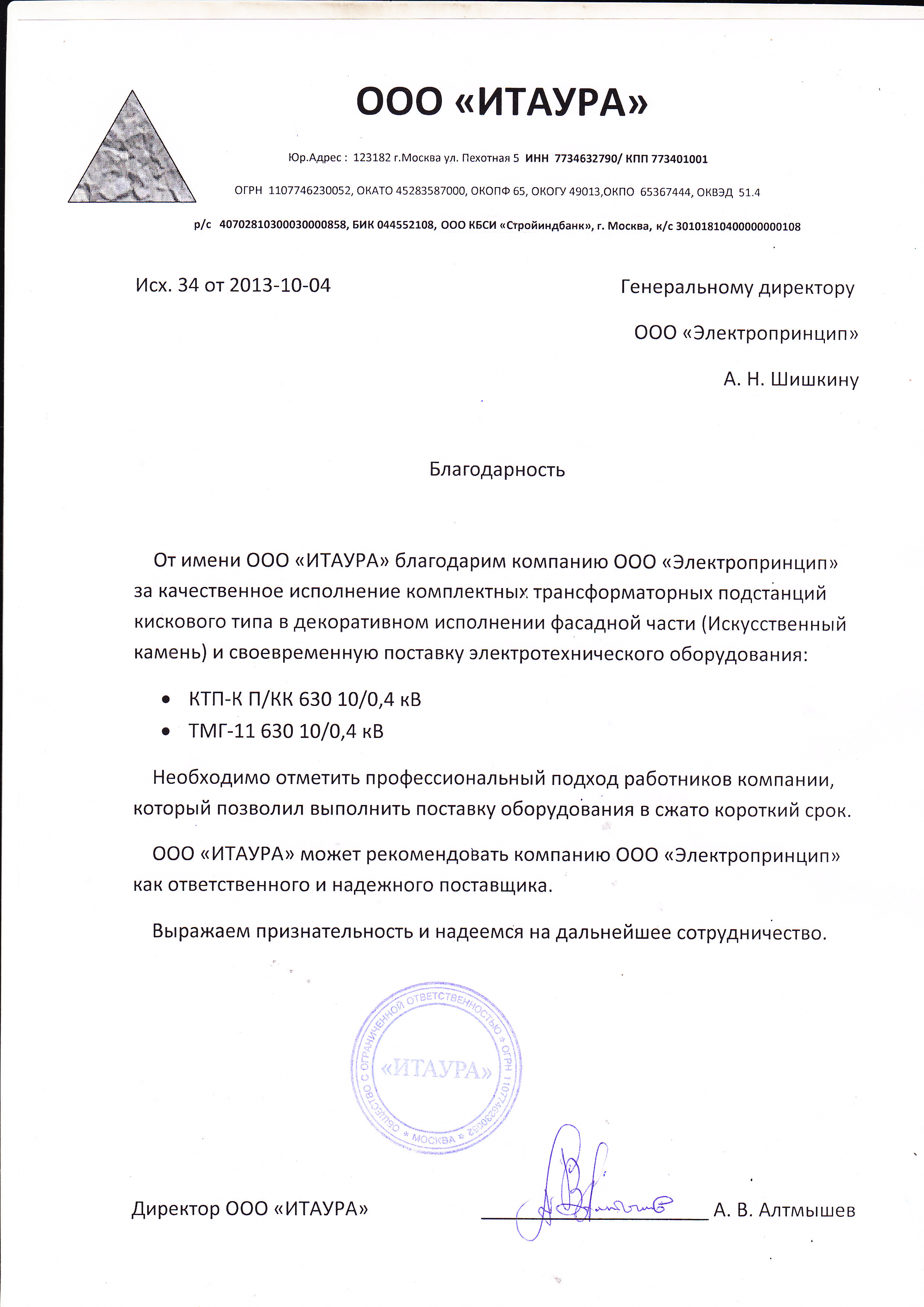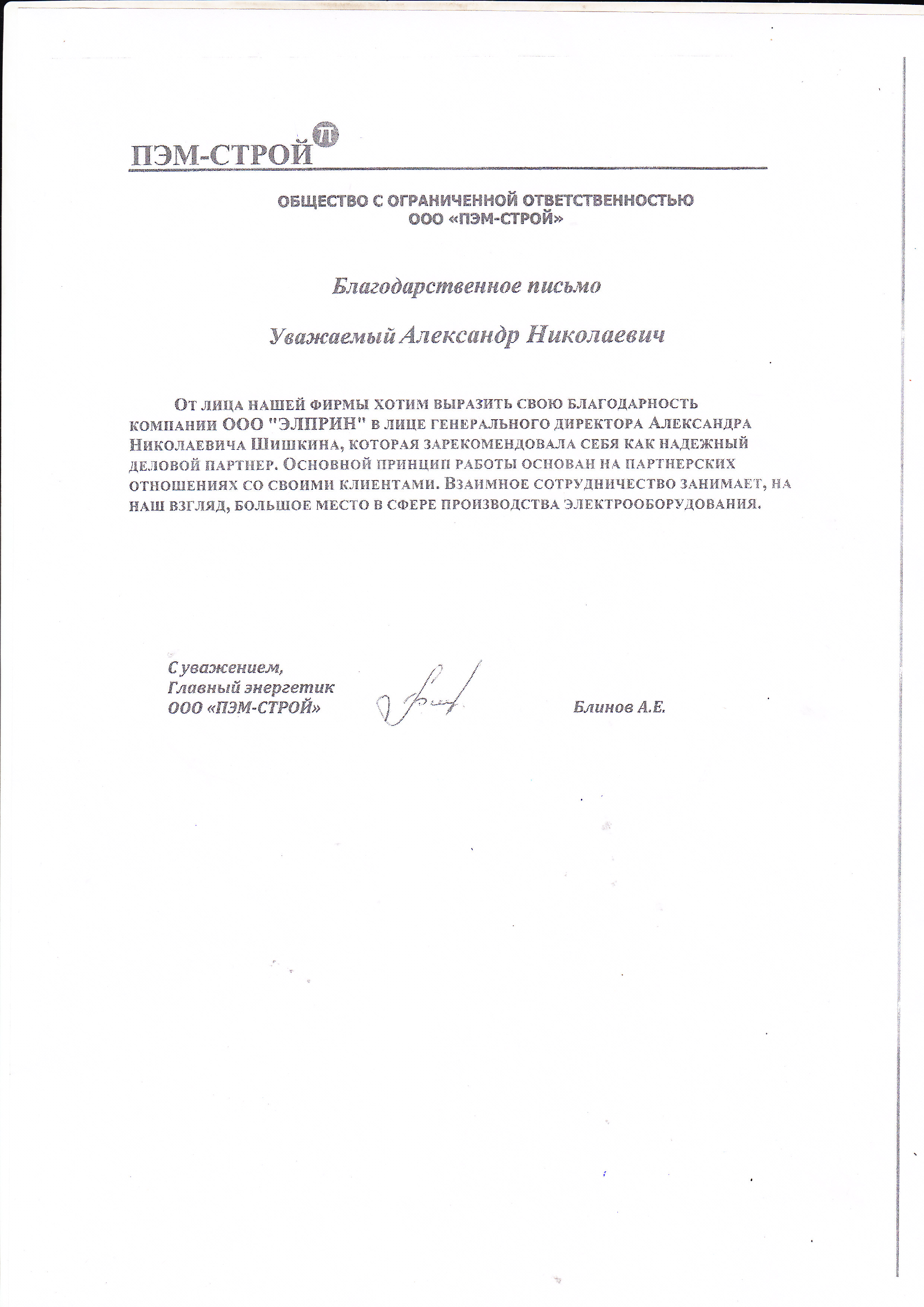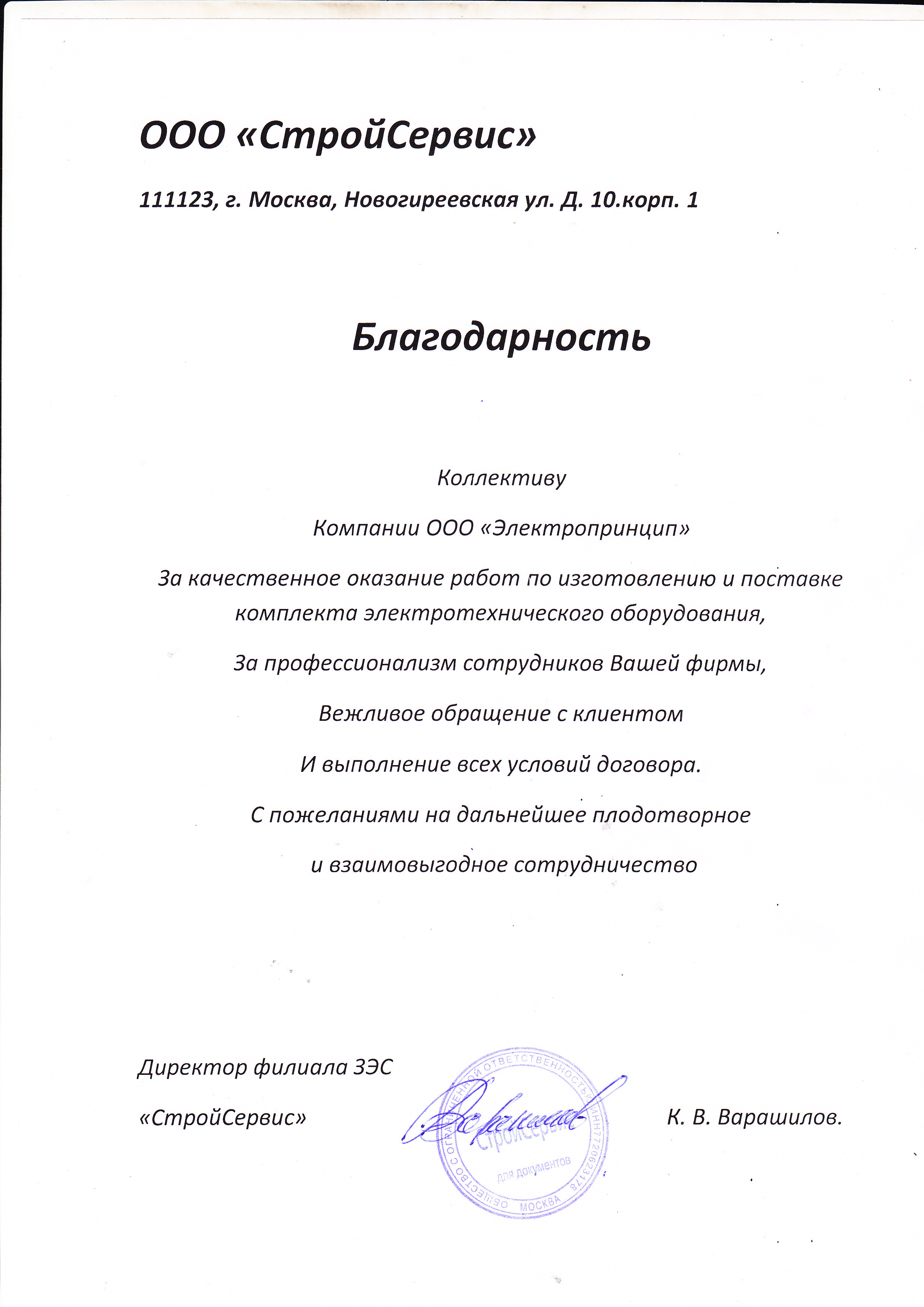 От лица нашей фирмы выражаем свою благодарность, компании "Электропринцип", которая зарекомендовала себя, как надежный партнер