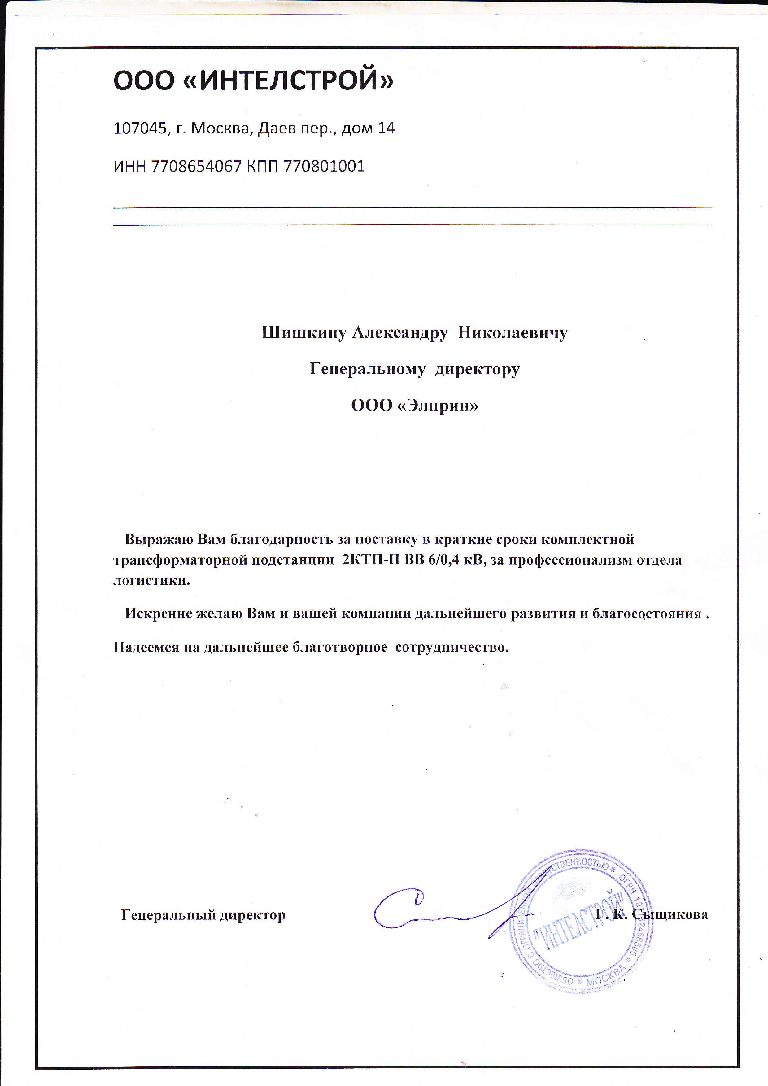Выражаю Вам благодарность за поставку в краткие сроки комплектной трансформаторной подстанции.