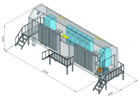 2БКТП НП представляет собой сэндвич контейнер с технологичким оборудованием. Расположение КТПНТ и НКУ можно увидеть н а рисунке ниже. При компановке нескольких контейнеров крыша поставляется отдельно. Площадки обслуживания изготовляются съемными. Воздушные ввода кабелей заводяться через порталы.