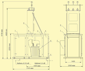 Мощность до 630 кВа. Габрит КТППАС и КТПТАС представлен на рисунке выше. УВН реализуется на КСО-3, РУНН на базе ЩО-91. ОСТ по умолчанию комплектуется маслянным трансформатором ТМГ, по пожеланию заказчика ОСТ может монтироваться сухой трансформатор ТСЗ. Шкаф УКРМ и АУКРМ монтируется на внешней стороне КТППАС и КТПТАС.