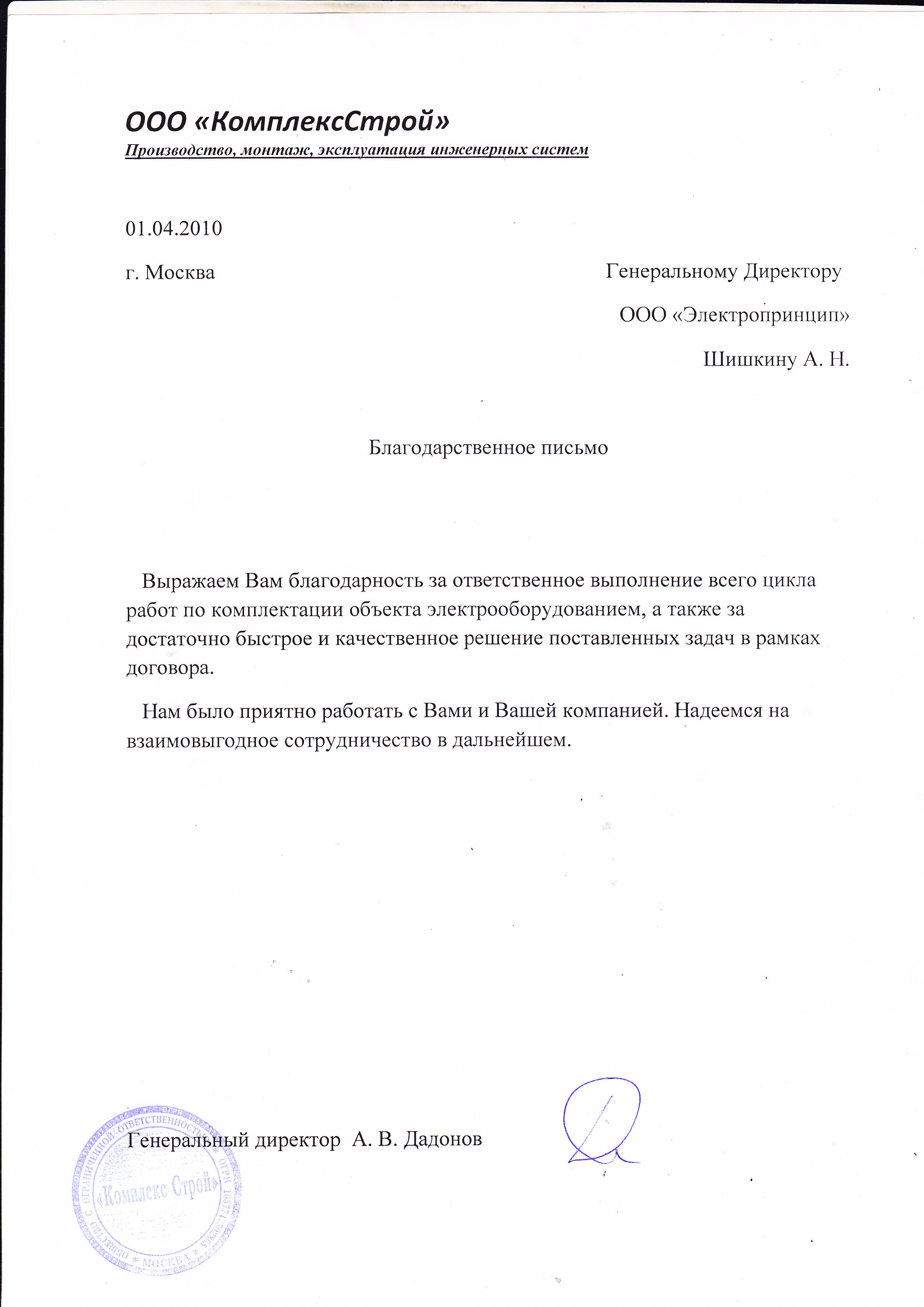 Выражаем Вам благодарность за ответственное выполнение всего цикла работ по комплектации объекта электрооборудованием.