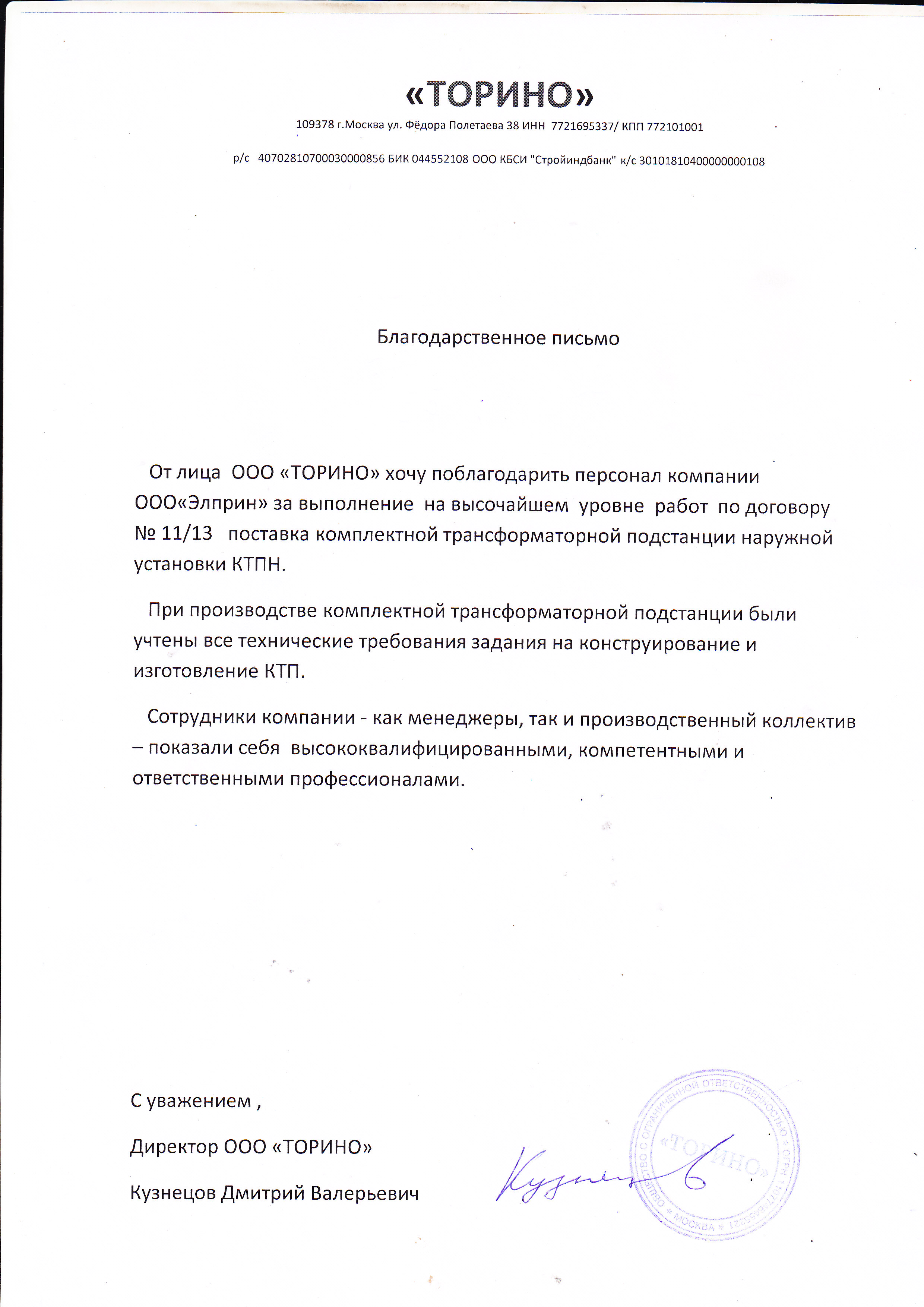 Выражаю Вам благодарность за поставку в краткие сроки комплектной трансформаторной подстанции.