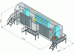 2БКТП НП представляет собой сэндвич контейнер с технологичким оборудованием. Расположение КТПНТ и НКУ можно увидеть н а рисунке ниже. При компановке нескольких контейнеров крыша поставляется отдельно. Площадки обслуживания изготовляются съемными. Воздушные ввода кабелей заводяться через порталы.