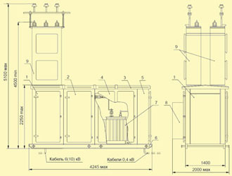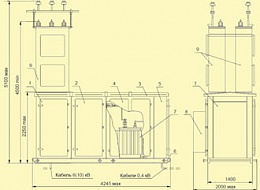 Мощность до 630 кВа. Габрит КТППАС и КТПТАС представлен на рисунке выше. УВН реализуется на КСО-3, РУНН на базе ЩО-91. ОСТ по умолчанию комплектуется маслянным трансформатором ТМГ, по пожеланию заказчика ОСТ может монтироваться сухой трансформатор ТСЗ. Шкаф УКРМ и АУКРМ монтируется на внешней стороне КТППАС и КТПТАС.